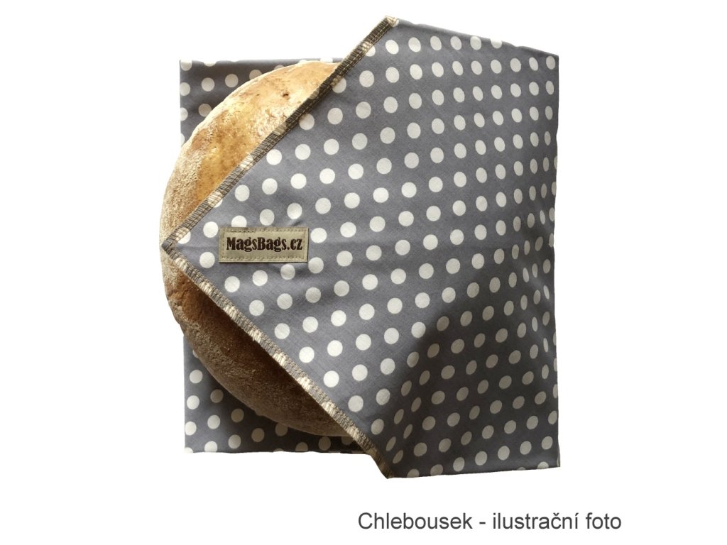 Ubrousek je šitý na velký, až 1,5kg bochník chleba, ale pohodlně se vejde i šiška klasické Šumavy. Chlebousek je velmi variabilní a dostatečně velký. Rozměry chlebousku jsou 55cm x 55cm.