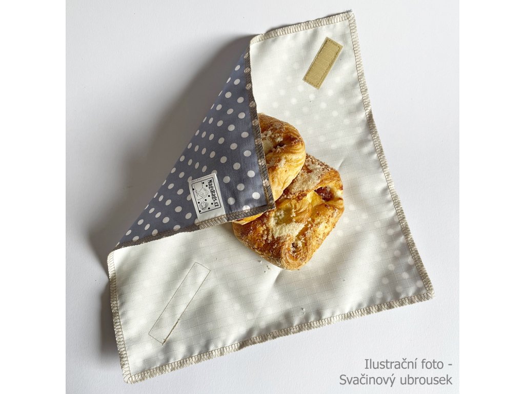 Svačinový ubrousek je praktický pomocník na přenášení svačiny. Je funkční, vnitřní látka je lehce omyvatelná. Použijete jej nejen na přenos svačiny, ale i při jídle. Nezbytný pro malé školáky. Při svačení si mohou nakousanou svačinu odložit na ubrousek, neušpiní si tak lavici a následně pracovní pomůcky. Stejně tak jej využijete v práci, při cestách vlakem nebo na výletě v lese.